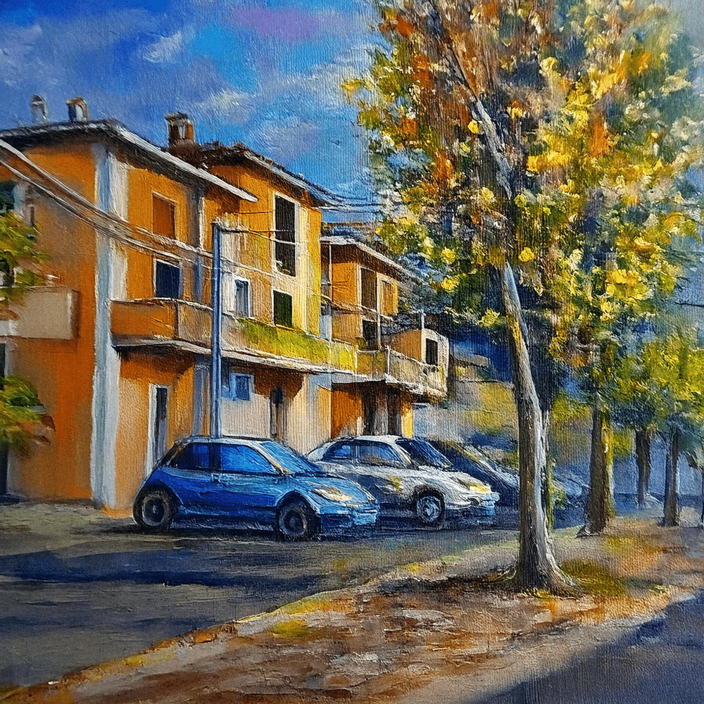 “dipinto ad olio che ritrae una zona periferica di Milano in una mattinata soleggiata di autunno”